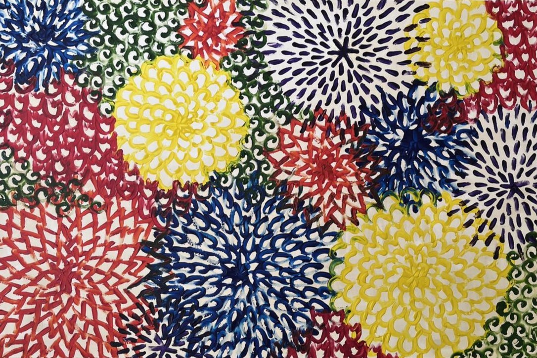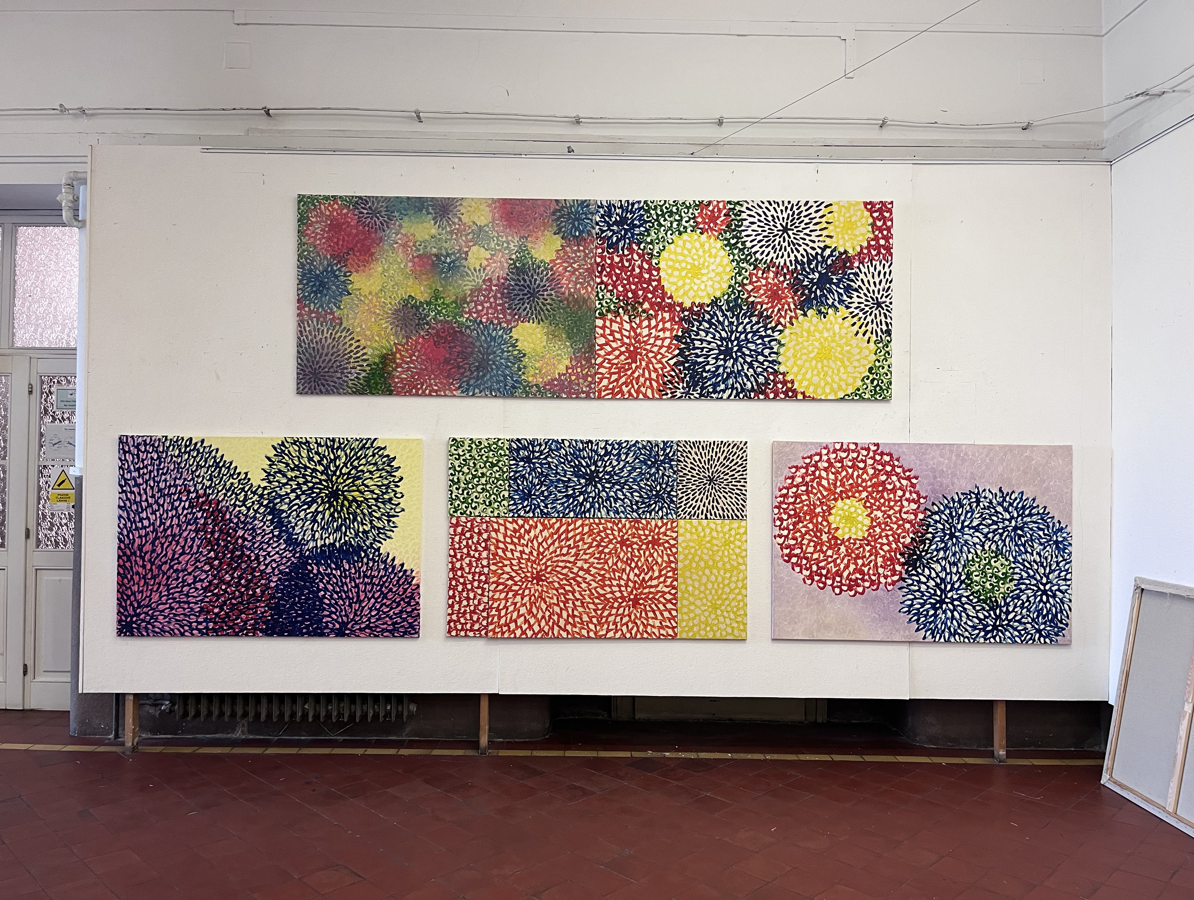 První obraz v sérii představuje stylizované květiny jako barevné skvrny, které je možné volně kombinovat. Trojici žlutých květů doplňuje modrá, oranžová a fialová, červené a zelené plochy vyplňují volný prostor. Barva sama vytváří světlo a prostor. Obraz byl namalován prsty a jeho kompozice může připomínat letecký pohled na zahradu nebo mikrosvět.