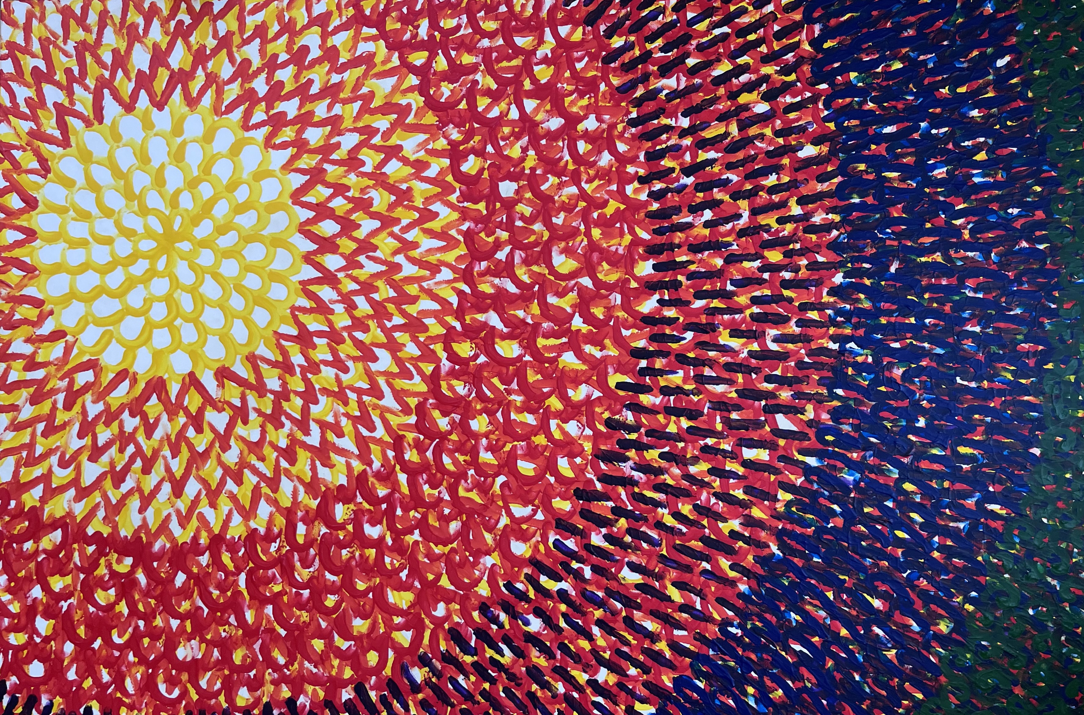 I tato malba vznikla nanášením akrylu prsty na plátno. Použila jsem čisté barvy a jejich vrstvením vznikla téměř plastická struktura. Oproti ostatním obrazům vycházejí všechny tvary z jednoho bodu. Obraz může evokovat květ nebo vrstvy Země.