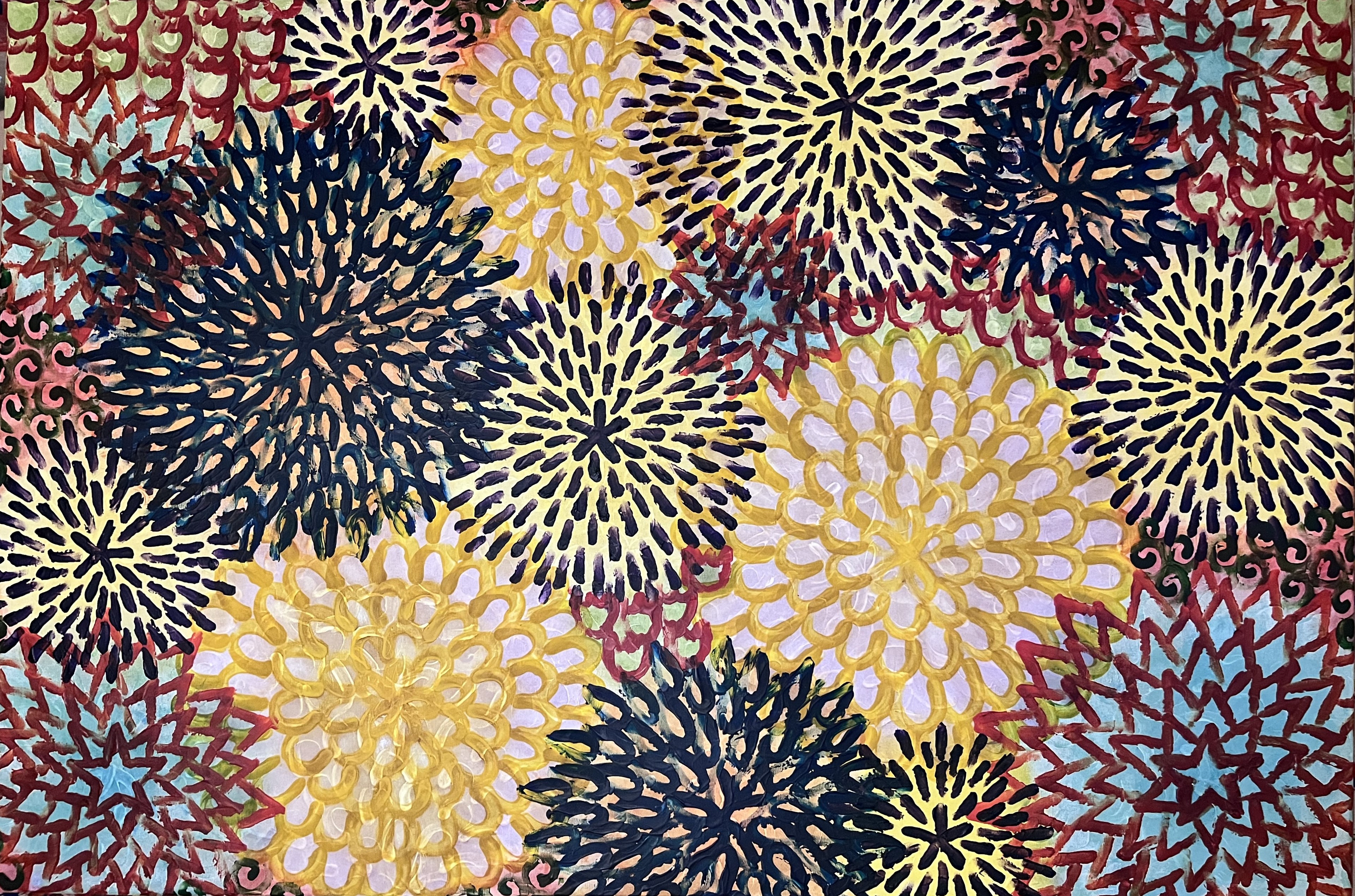 Další obraz, který je založen na barevných kontrastech - barvách stojících naproti sobě v barevném kruhu. Díky tomuto uspořádání působí energicky a dynamicky, a přitom si zachovává vnitřní řád a vyváženost.